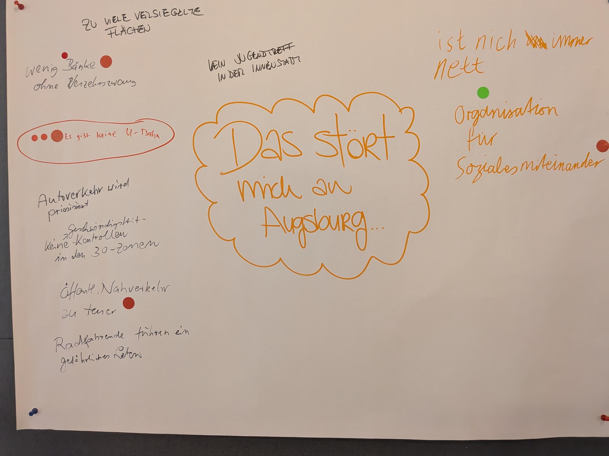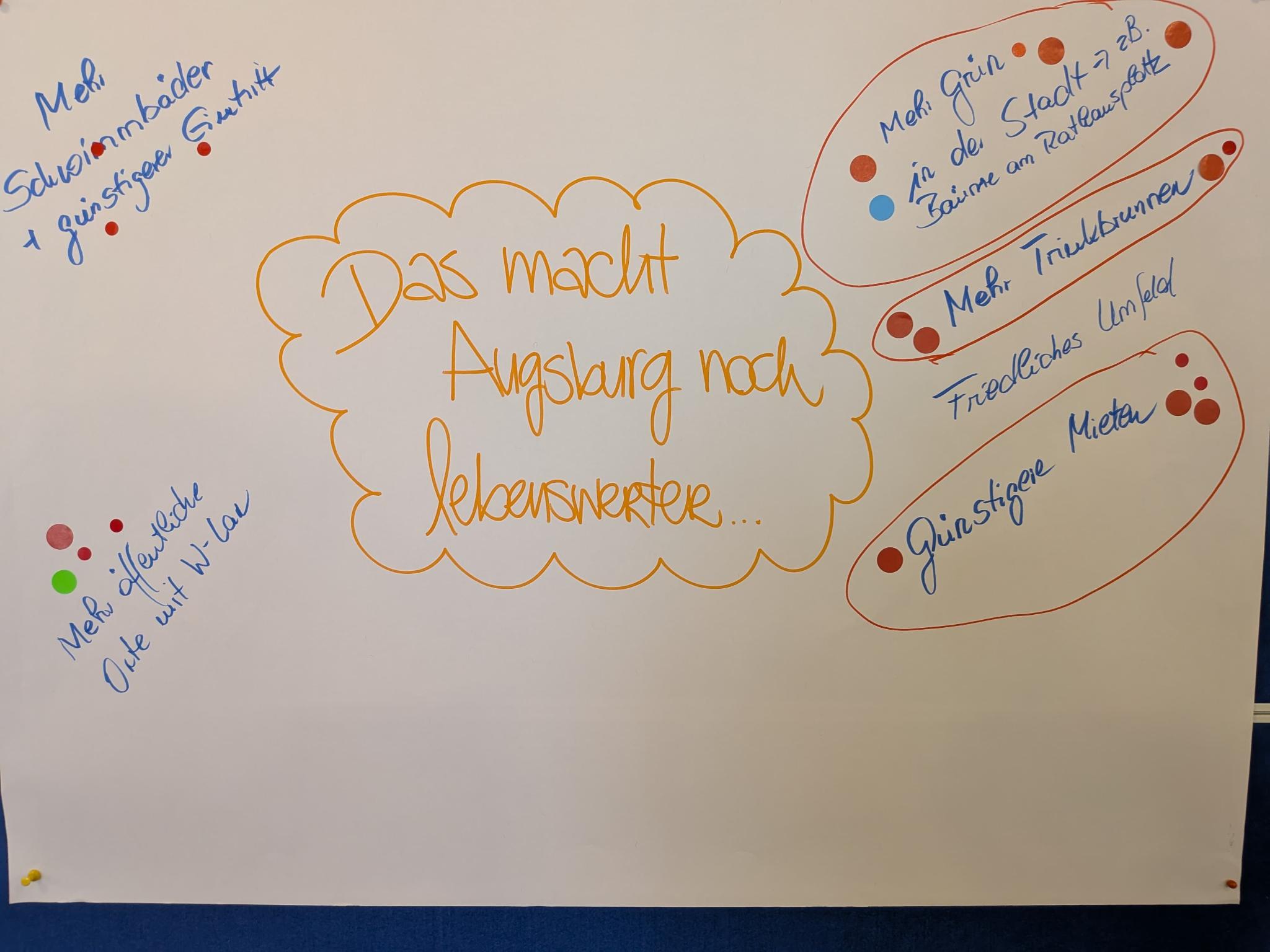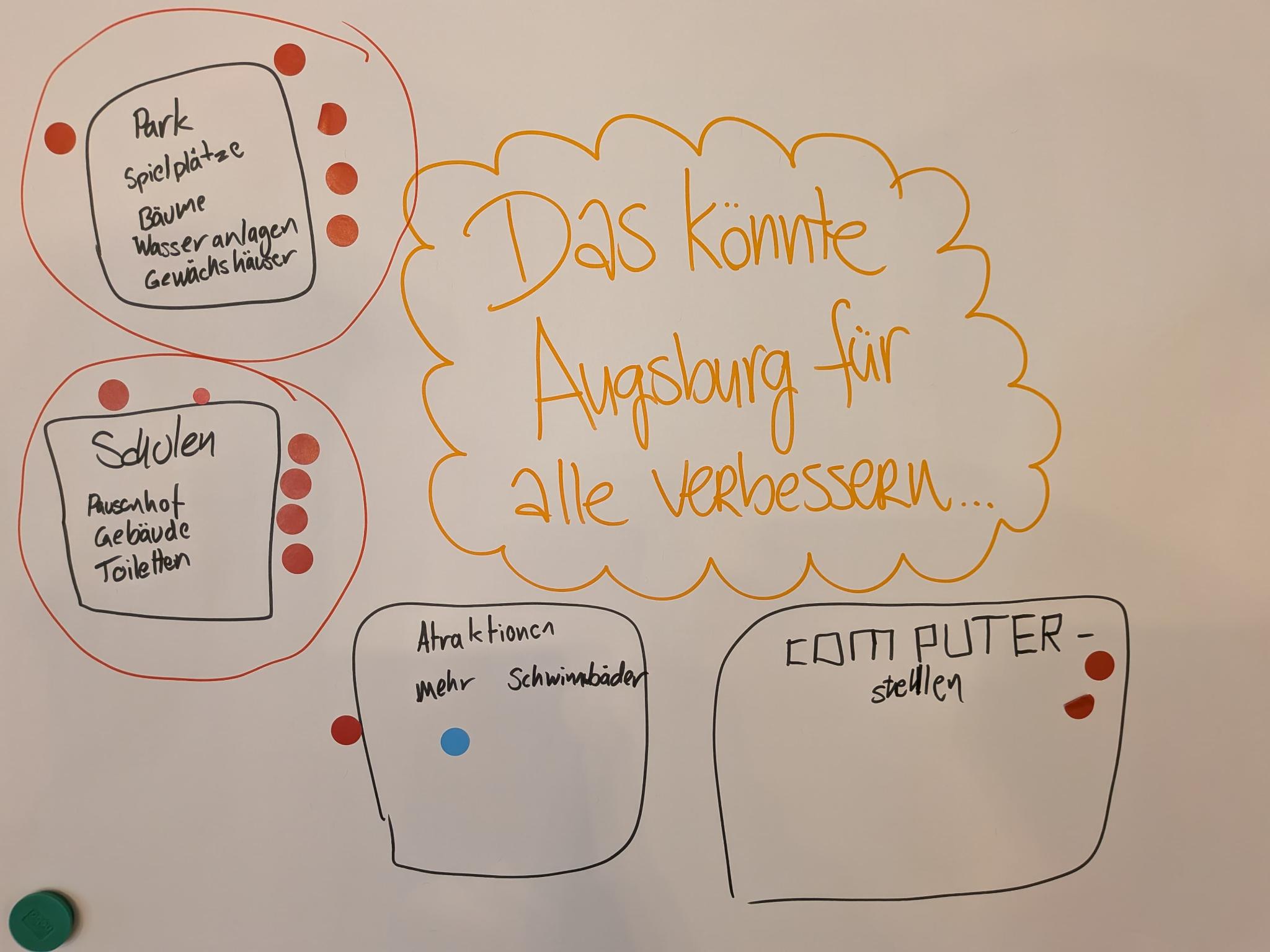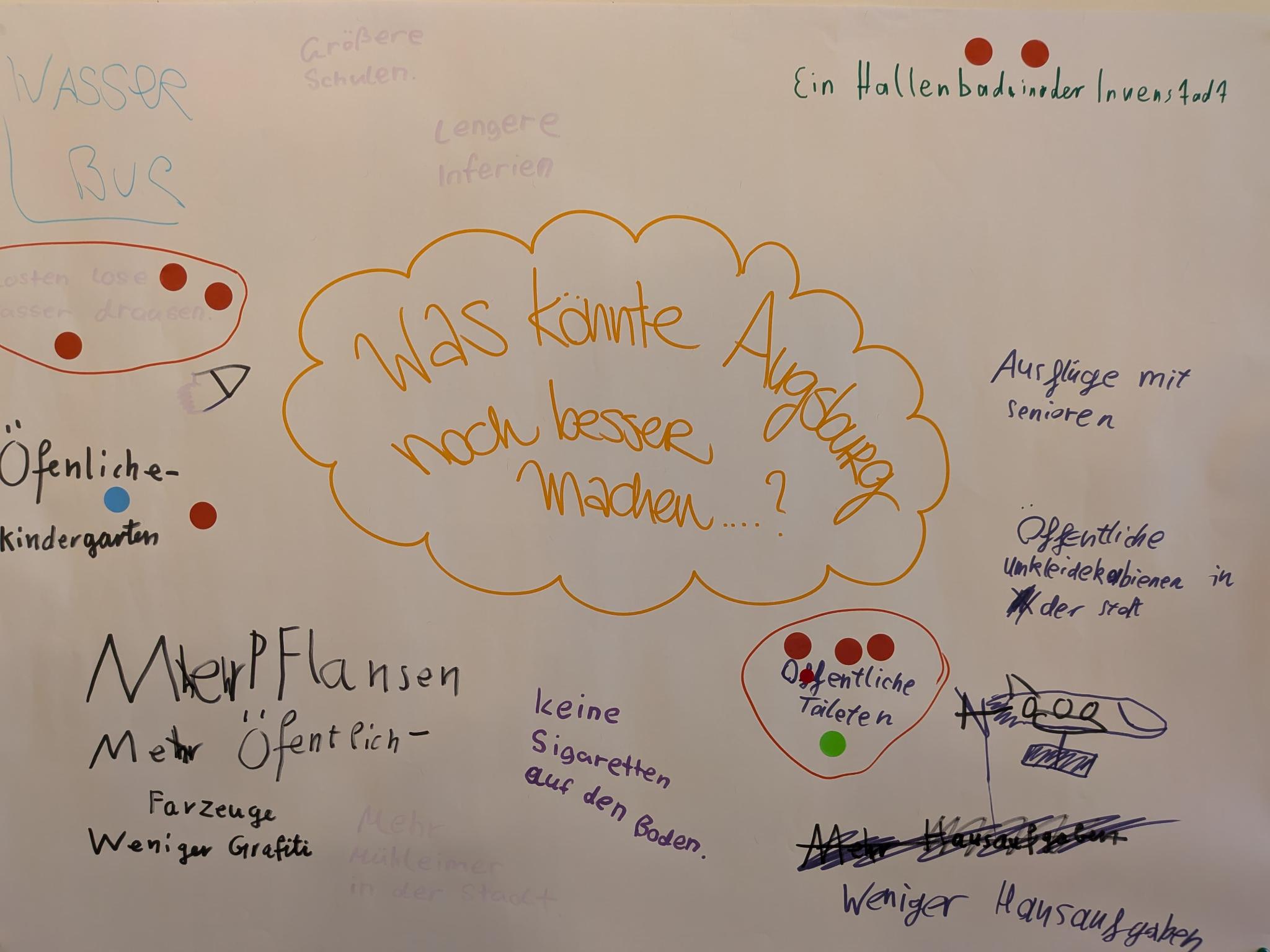Dabei wurde deutlich, dass den Teilnehmenden vor allem ein grüneres Augsburg wichtig ist – mit mehr sonnengeschützten Plätzen zum Verweilen, zusätzlichen Bewegungsmöglichkeiten für alle Generationen und mehr Trinkwasserbrunnen im Stadtgebiet. Für den Helmut-Haller-Platz in Oberhausen sowie den Rathausplatz wurden konkrete Gestaltungsvorschläge erarbeitet. Zudem gab es die Anregung, ein Schwimmbad mit mehreren Sprungtürmen und einer 50-Meter-Bahn zu errichten. Auch utopische Ideen hatten ihren Platz – die geplante Achterbahn für das Jakob-Fugger-Gymnasium sorgte für Begeisterung, wird jedoch wohl ein Traum bleiben.