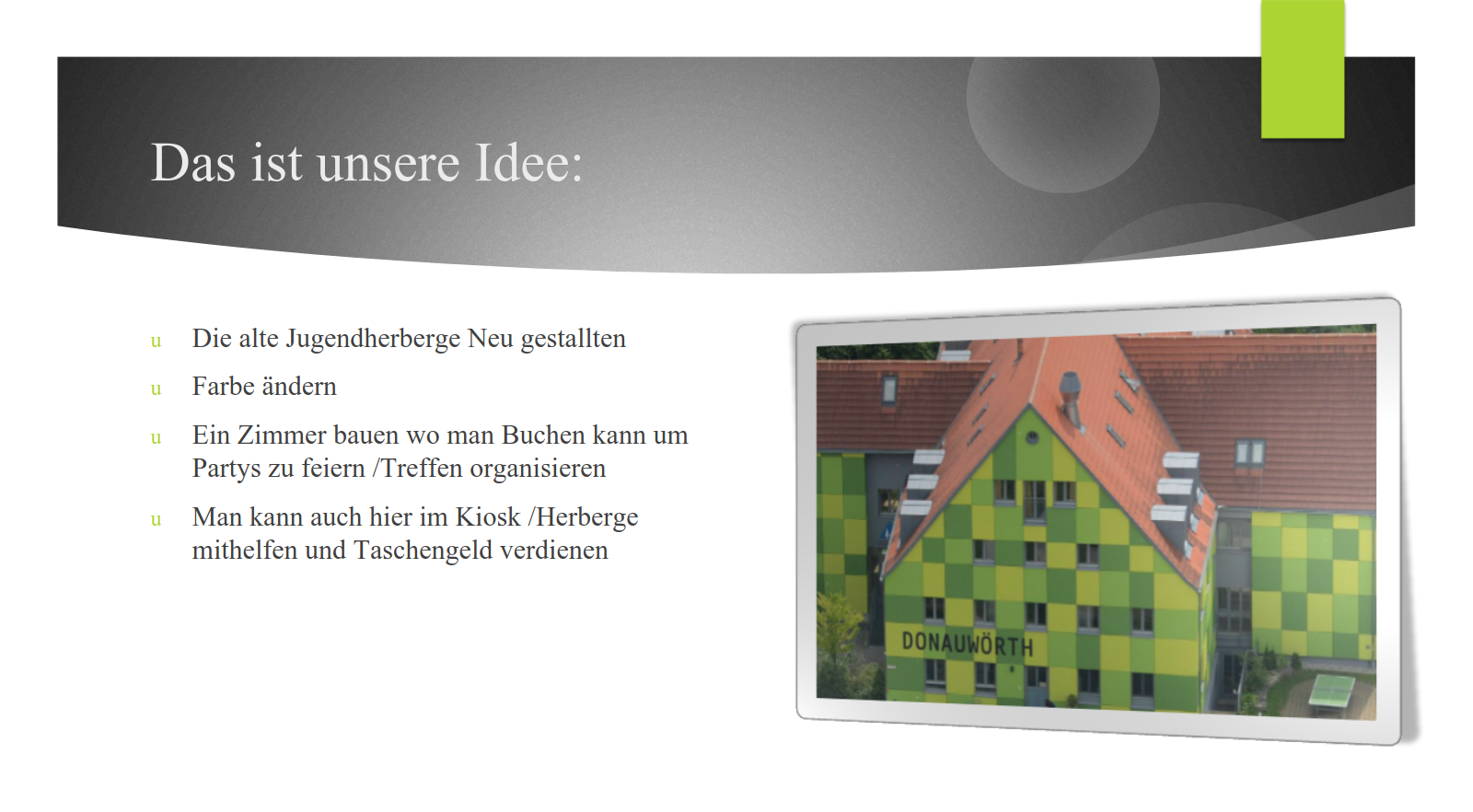 Soziales & GemeinschaftEine Jugendherberge mit Veranstaltungsräumen, damit Jugendliche, die von außerhalb kommen, eine Übernachtungsmöglichkeit nach dem Feiern in Donauwörth haben.