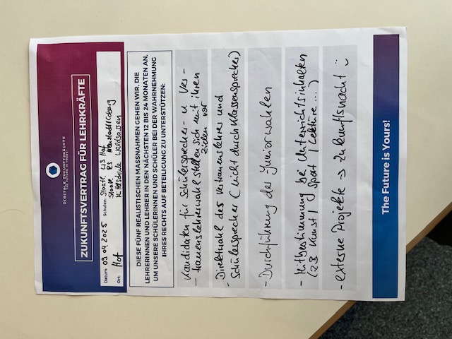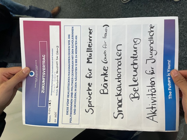 Der Landrat Sebastian Straubel hat sich am 14. Mai 2025 in der Schule eingefunden, um mit den Schülerinnen und Schülern, die an der Zukunftsnacht teilgenommen hatten, über deren Ideen zu diskutieren.